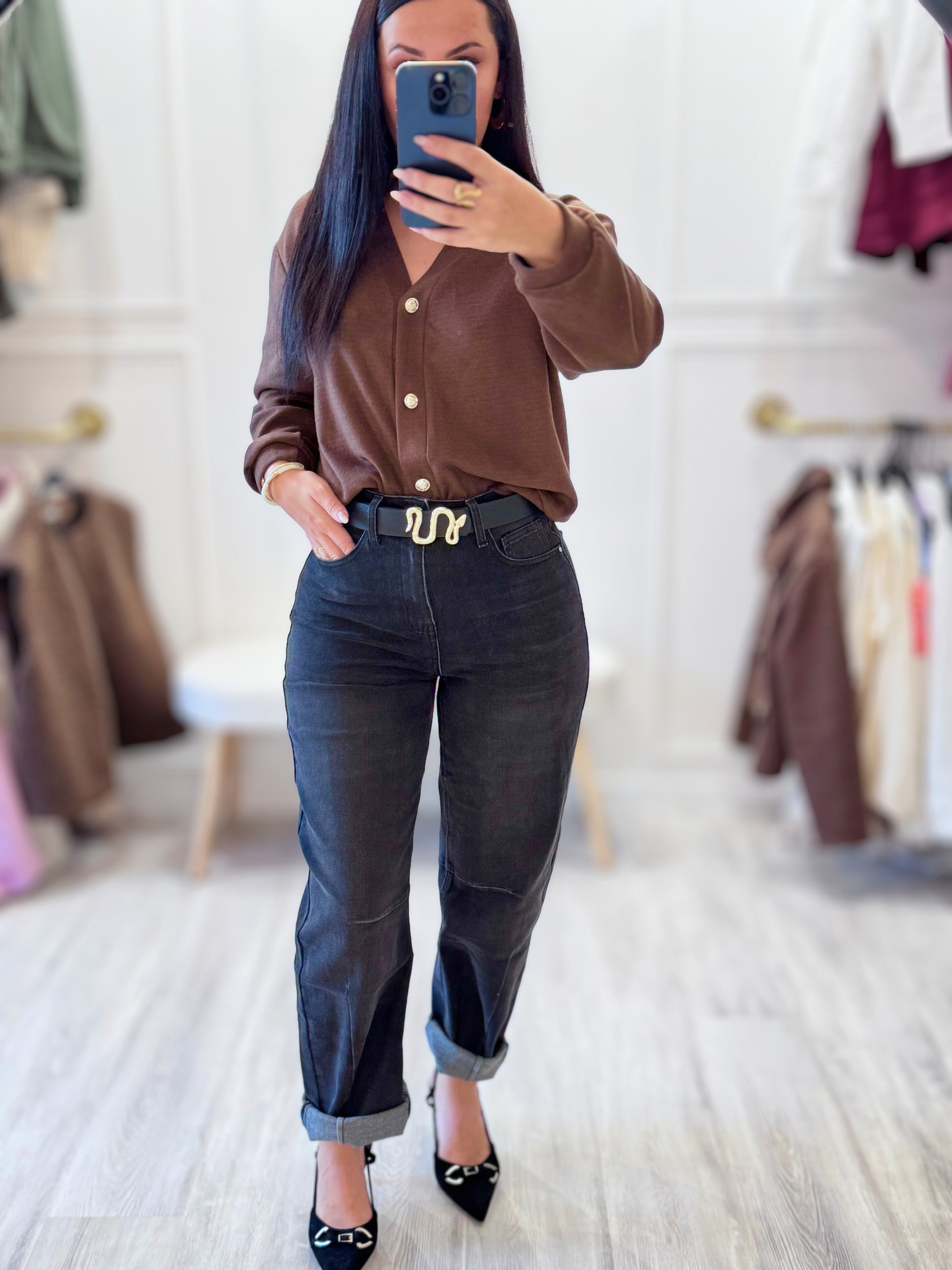 Dans sa version marron, le cardigan Émilie révèle toute la chaleur de l’automne 🍂. Sobre et élégant, il séduit par ses boutons dorés qui contrastent avec la teinte profonde du tissu. Confortable et chic, il s’impose comme une pièce essentielle de la saison.