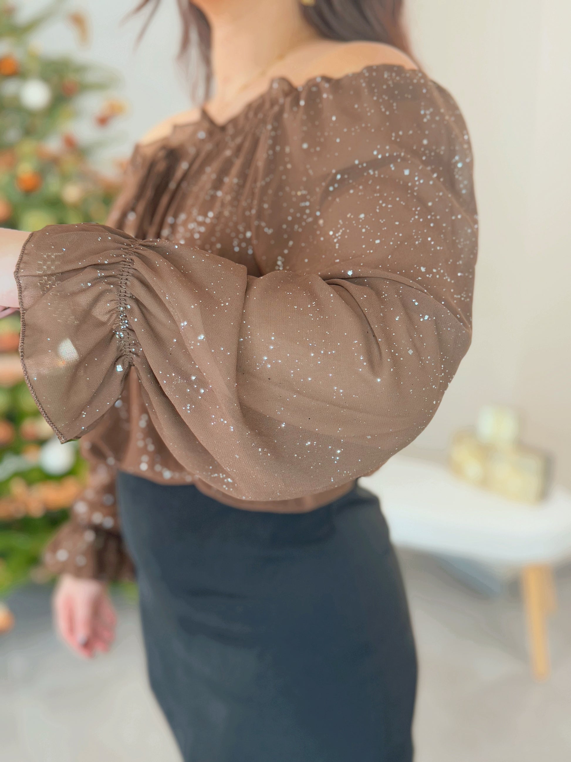 Le tissu effet mousseline est fluide et agréable. Les petites paillettes apportent juste ce qu’il faut d’éclat. L’encolure élastique se place comme tu veux, épaules dégagées ou légèrement relevées. Les manches bouffantes donnent une allure douce et élégante.