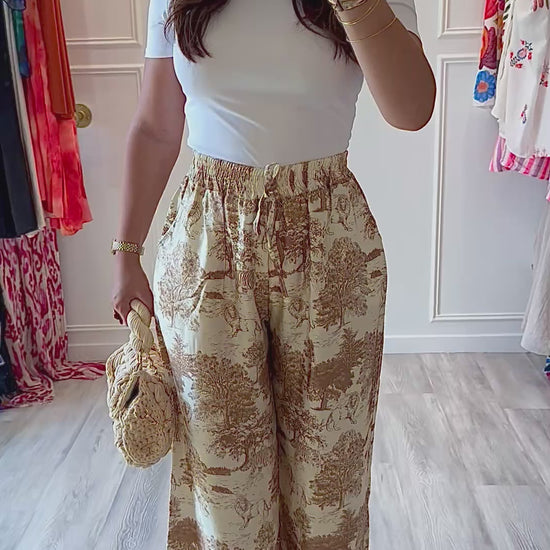 Le pantalon Camille revient dans une version beige et marron clair, toujours avec sa matière soyeuse et son imprimé "toile de Jouy jungle" revisité.