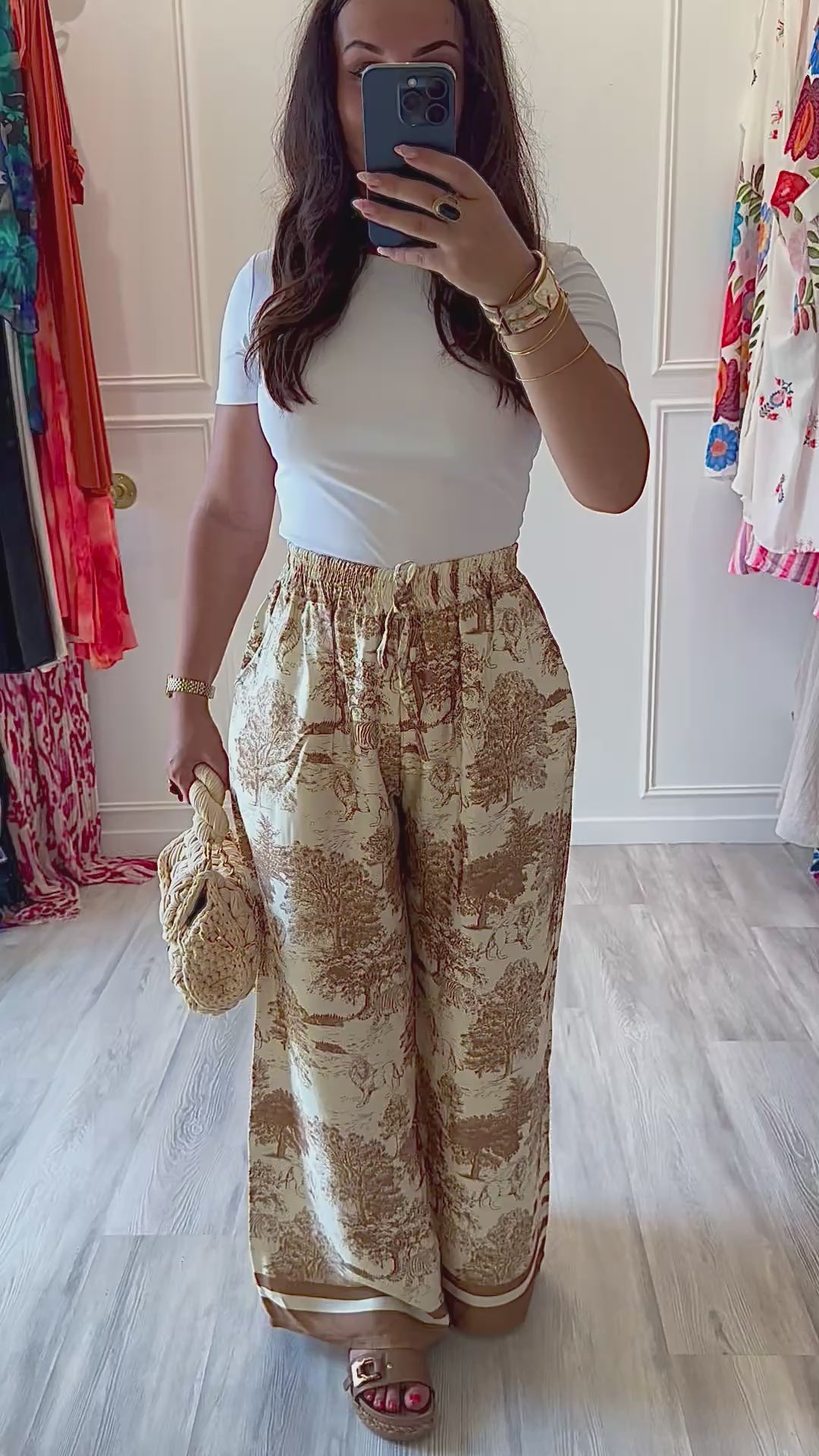 À porter avec un haut blanc ou crème, des sandales plates en cuir ou des mules compensées, et un panier naturel. C’est le pantalon parfait pour un look “vacances chic” ou une balade en ville pleine d’allure 🍂