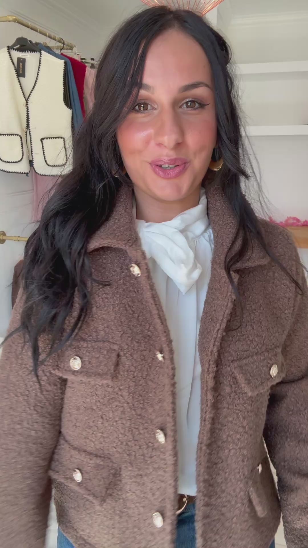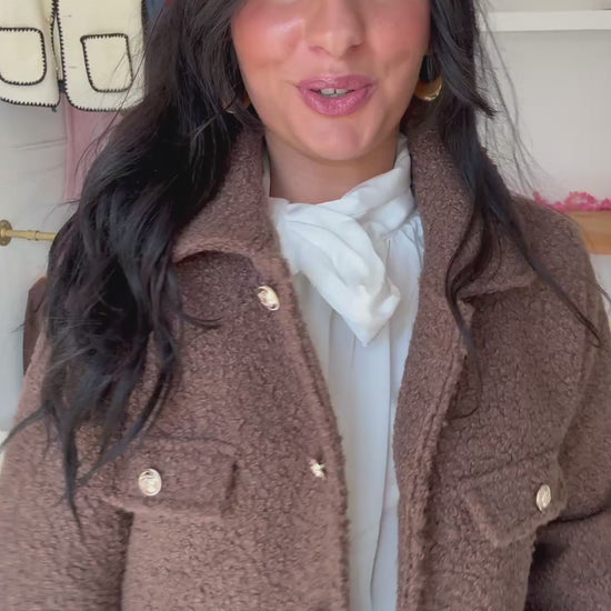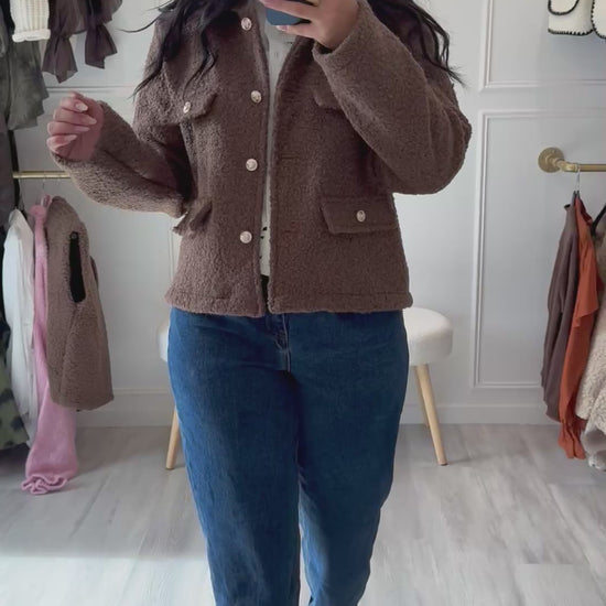 La veste Sofia incarne le parfait équilibre entre élégance et modernité 🌟. Confectionnée dans une matière bouclée douce, elle se distingue par ses boutons dorés qui illuminent la silhouette et ses poches plaquées, mêlant style et praticité. Sa coupe structurée en fait une pièce forte et sophistiquée, idéale pour la saison.